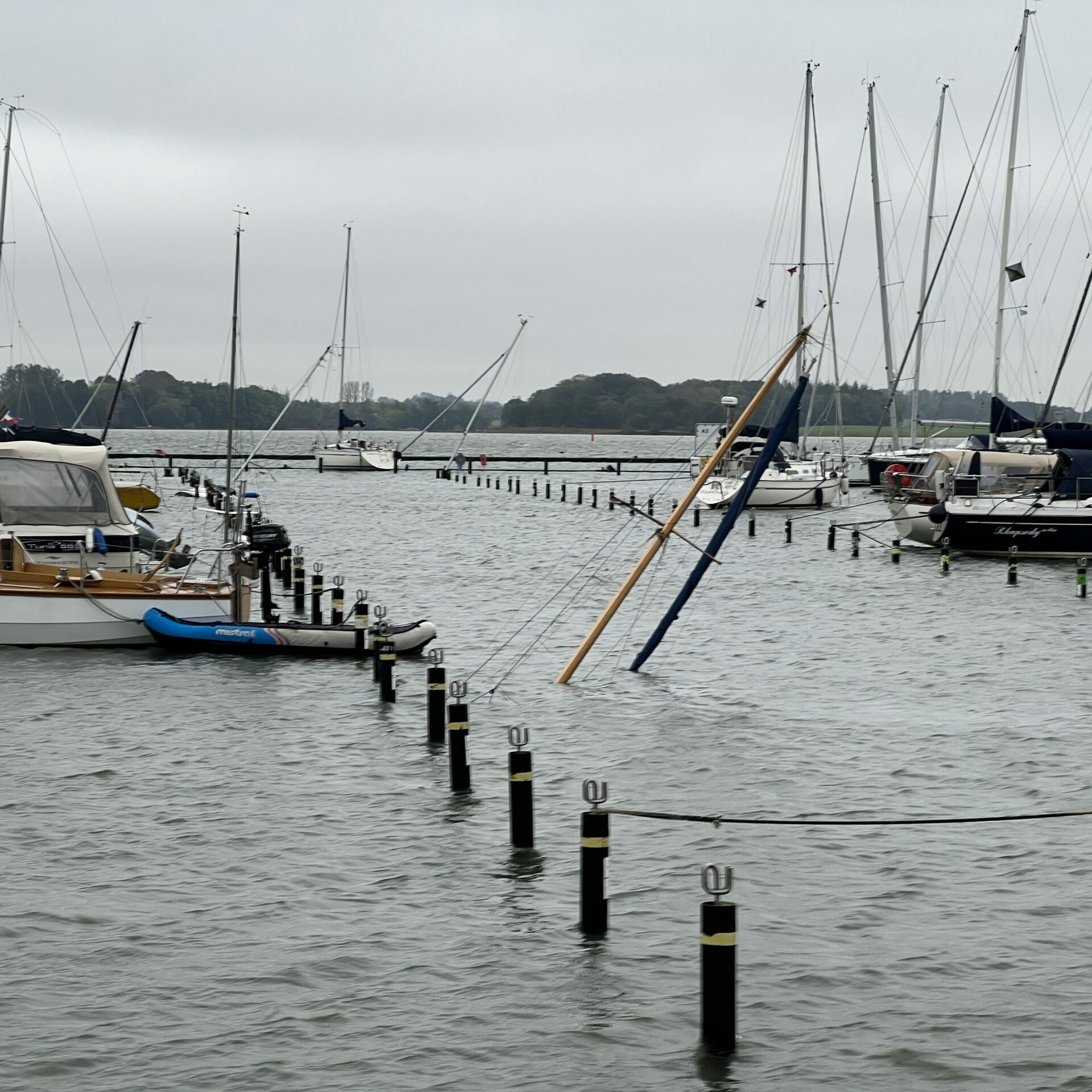 Die Steganlagen wurden meterhoch überflutet. Die Hafenmolen waren nicht mehr sichtbar. In der Ferne konnte man ausmachen, dass das Meer die Lotseninsel an der Schleimündung in weiten Teilen überspült hatte. Ab jetzt waren die Schlei und Maasholm der Natur schutzlos ausgeliefert. Die Yachten bewegten sich auf und ab wie auf hoher See. Viele Schiffe wurden von ihren Festmachern unter Wasser gezogen und sanken auf Grund. Einige wurden losgerissen und vertrieben. Manche blieben auf den Stegen liegen, andere kollidierten mit anderen Schiffen oder der Hafenmole. Zwei Yachten sanken jenseits des Hafens im Wormshöfter Noor, einer Ankerbucht westlich von Maasholm.