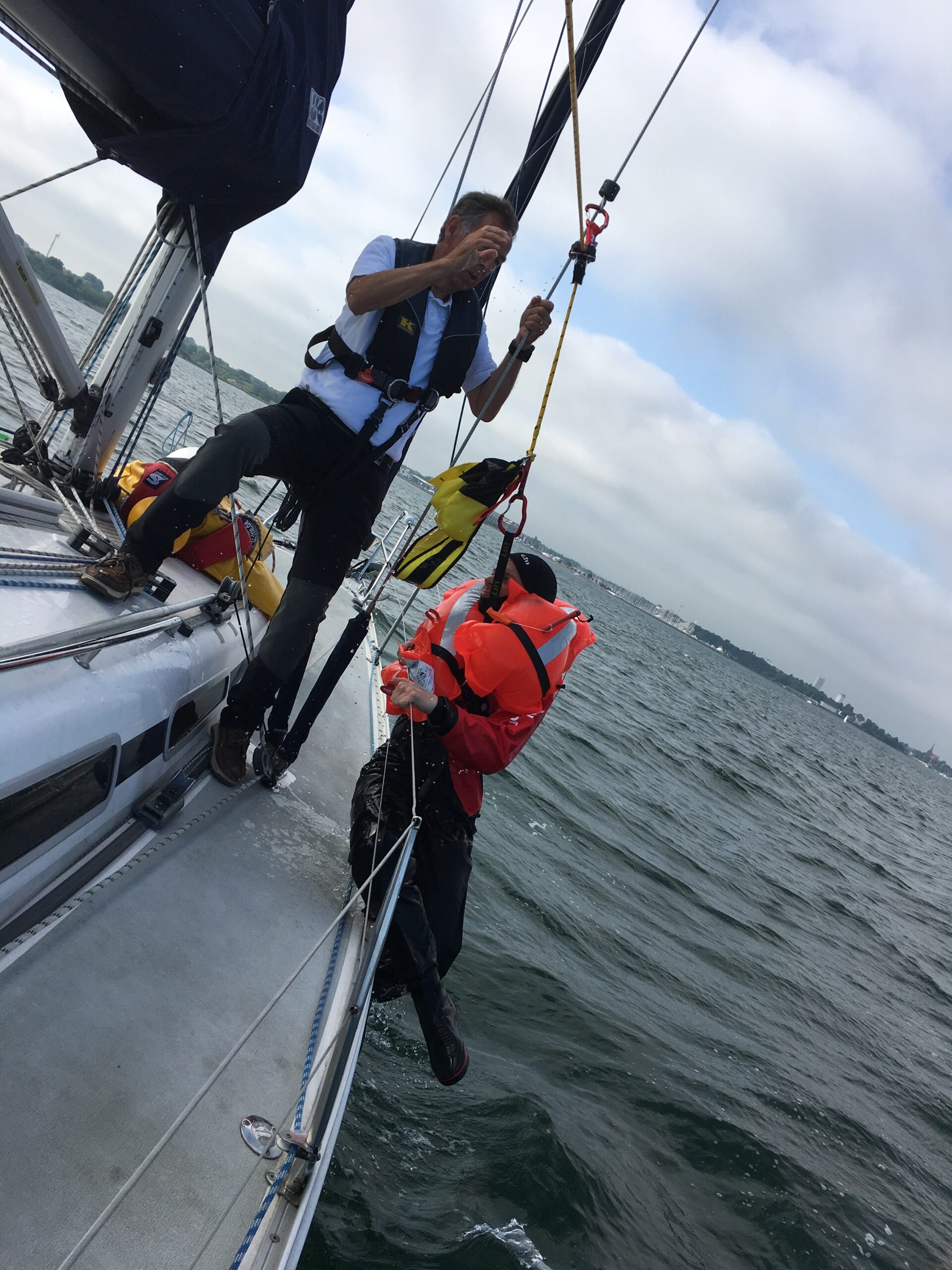Unter dem Motto „Sicherheitstipps für Skipper“ erläuterte Burkhard zunächst die Bedeutung von Rettungswesten und anschließend zeigte die Crew des RHE die Grenzen und Möglichkeiten bei der erfolgreichen Rettung einer über Bord gefallenen Person mit dem Walden Bergesystem. Nach insgesamt 6 Vorträgen und Vorführungen von je 45 Minuten ging es am Sonntag Nachmittag nochmals auf die Ostsee, um das neu auf den Markt gekommene Rettungssystem Catch and Lift zu testen. Dank der Bereitschaft von Gabi und Jan mit Trockenanzug in die Ostsee zu springen sowie der freundlichen Leihgabe des Herstellers war es möglich, sich von der Praxistauglichkeit des Systems zu überzeugen. Bei bestem Segelwetter verfolgten rund 600 Zuschauer unsere Vorführungen. Rebecca ergänzte unsere Präsentationen am Samstag und Sonntag durch Schnuppersegeln für Kinder, das so gut angenommen wurde, dass vereinzelt Kinder nicht zum Zuge kamen.